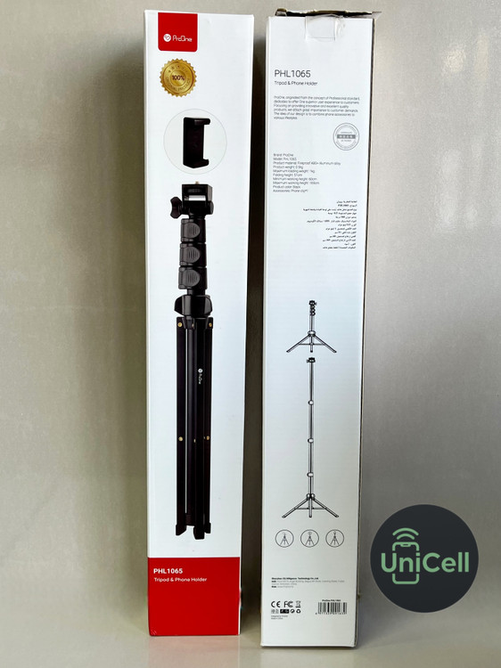 سه پایه موبایل و دوربین مدل PHL 1065یکی از محصولات شرکت «Proone» است. این محصول دارای کالایی با کیفیت بالا است که میتوان برای تولید محتوا ویدئویی، عکاسی و تصویربرداری از آن استفاده کرد. سه پایه پرووان دارای پایههای قابل انعطاف همراه با زیره پلاستیکی شیاردار برای جلوگیری از لیز خوردن روی سطوح مسطح قرار گرفته است. این ابزار جانبی دارای یک هولدر نگهدارنده قابل تنظیم برای موبایل و دوربینهایی با وزن کمتر از 2 کیلوگرم است. جنس قسمت بالایی این محصول از پلاستیک ABS و پایههای آن از جنس آلومینیوم میباشد. یکی از قابلیتهای این سه پایه چرخش به صورت 360 درجه است که کار با این محصول را لذت بخشتر کرده است. طول این محصول در حالت جمع شده 51 سانتیمتر، حداقل ارتفاع 60 سانتیمتر و حداکثر ارتفاع 169 سانتی متر میباشد.